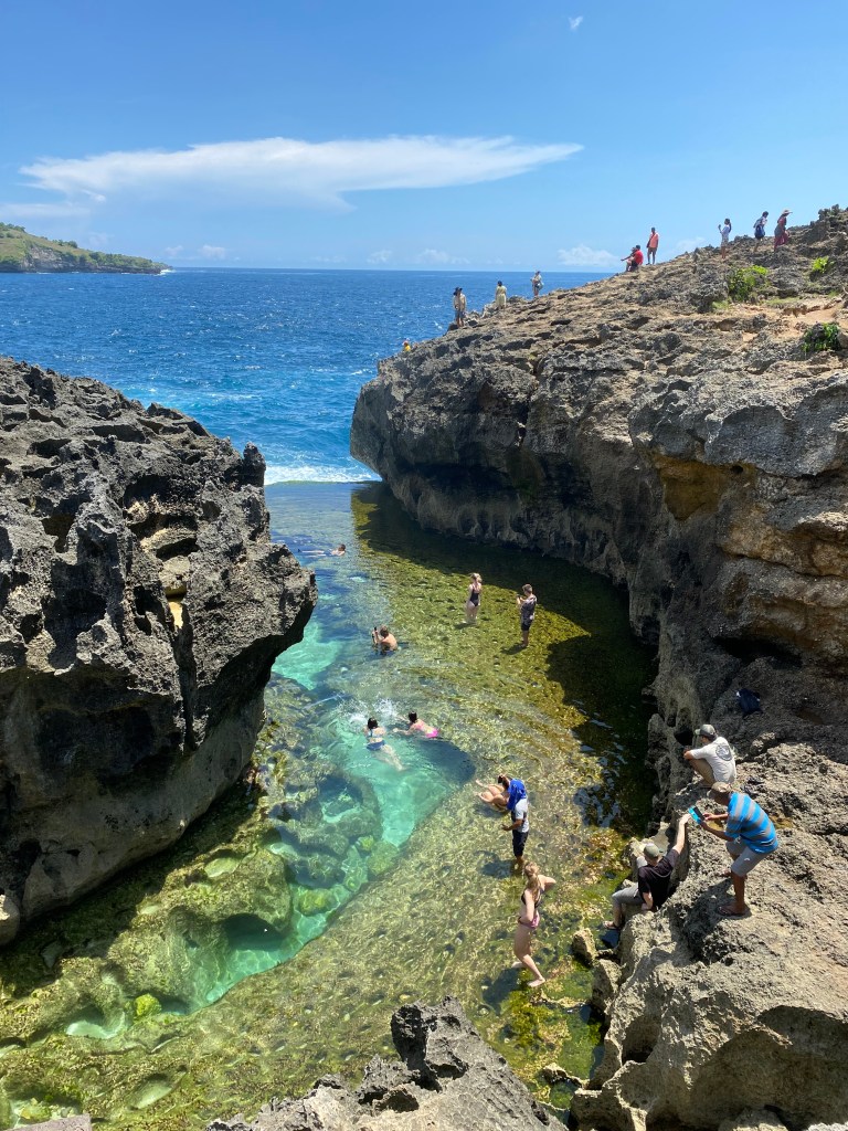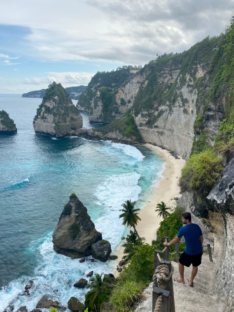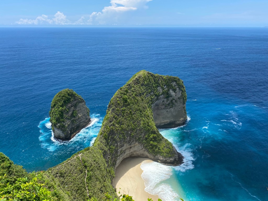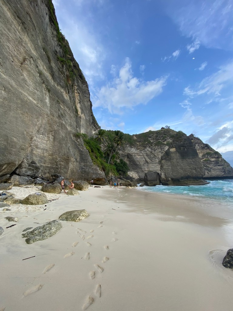 Dit strand is inmiddels zonder twijfel een van de meest gefotografeerde plekken ter wereld. Ik bereid je meteen voor, want het is druk (héél druk) bij dit uitzichtpunt. Toch mag je deze highlight niet overslaan, want het is inderdaad een prachtig gezicht. Kelingking beach ligt in een baai tussen indrukwekkende kliffen. Dat, in combinatie met het helderblauwe water, maakt het een heel mooi plaatje. Je kunt vanaf het uitzichtpunt afdalen naar het strand. Dit schijnt hoe lager je komt steeds wat uitdagender te worden (denk aan klimmen en klauteren). Wij hebben dit niet gedaan, maar als je de tijd hebt is dit denk ik een leuke activiteit en een goede work-out. Oja, sommigen zeggen dat de uitstekende rots aan het einde van de baai op een t-rex lijkt. Zie jij het?